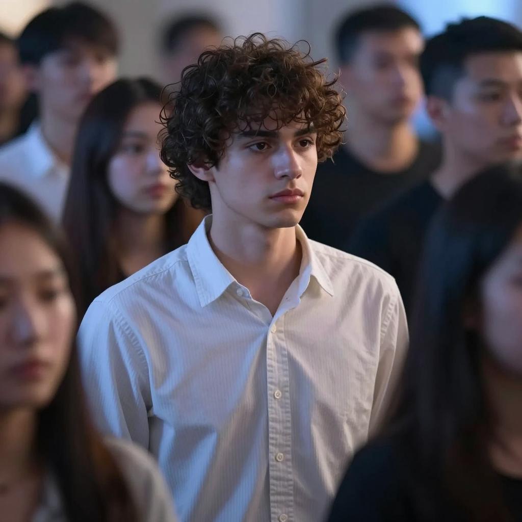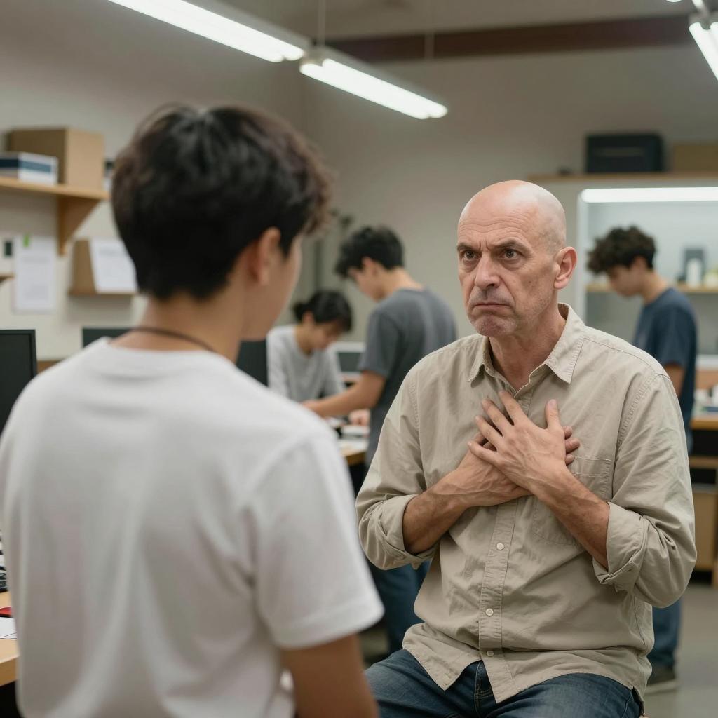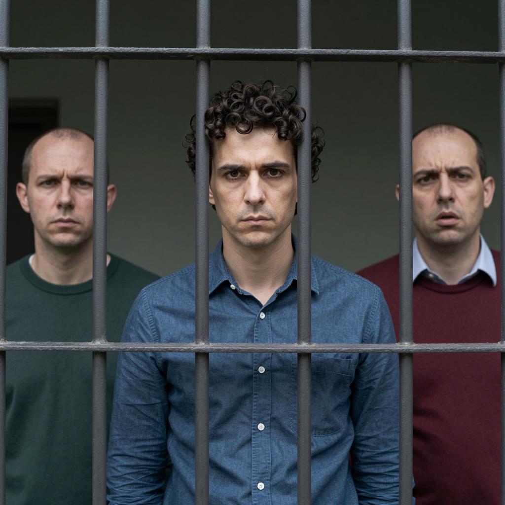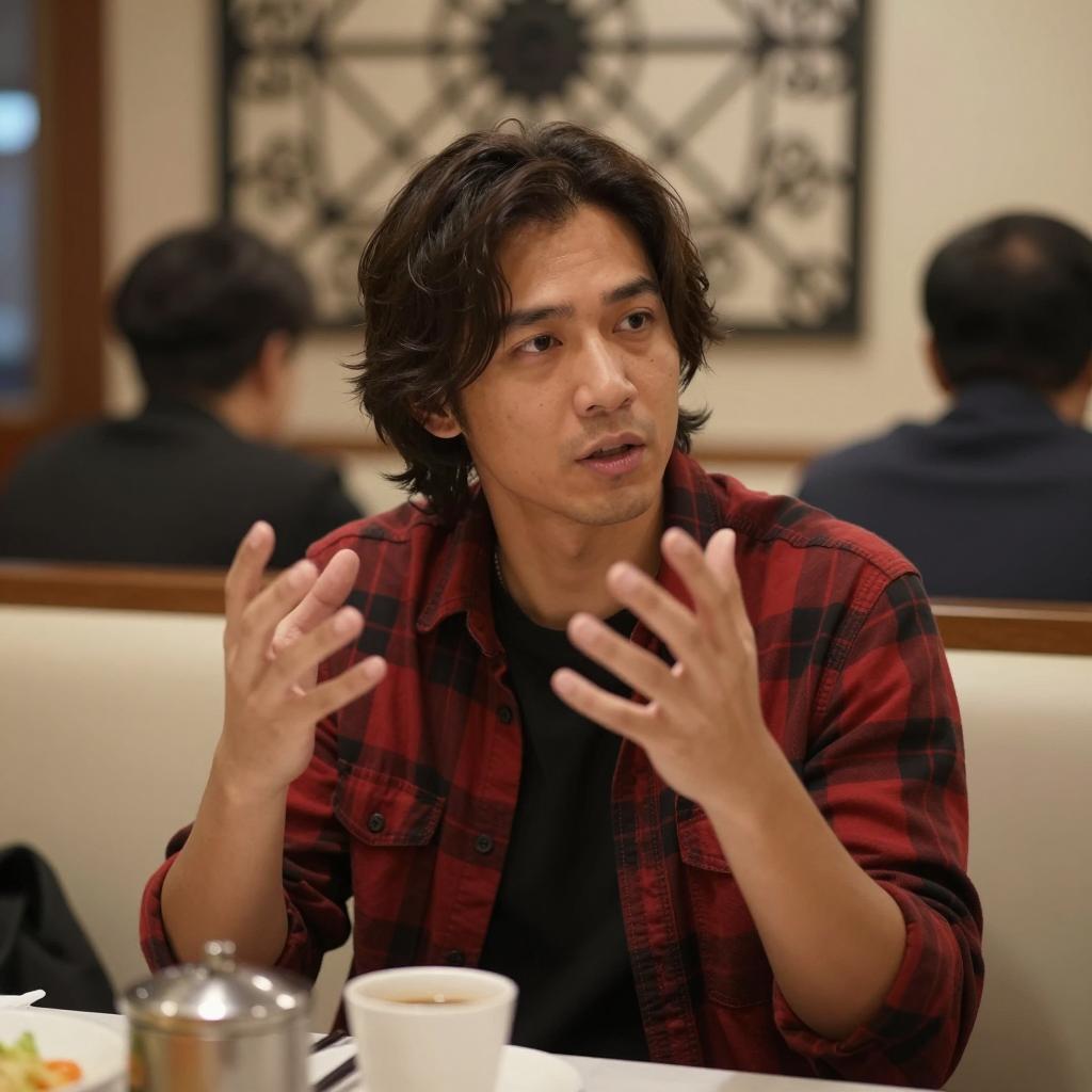 A man with curly dark hair, wearing a dark button-up shirt, gesturing with his hands. Background has a blurry, indistinct figure in a similar shirt. Man's face shows intense expression. Two other blurred figures in dark clothing in the background. Door on left side. Smoke or mist in the air.