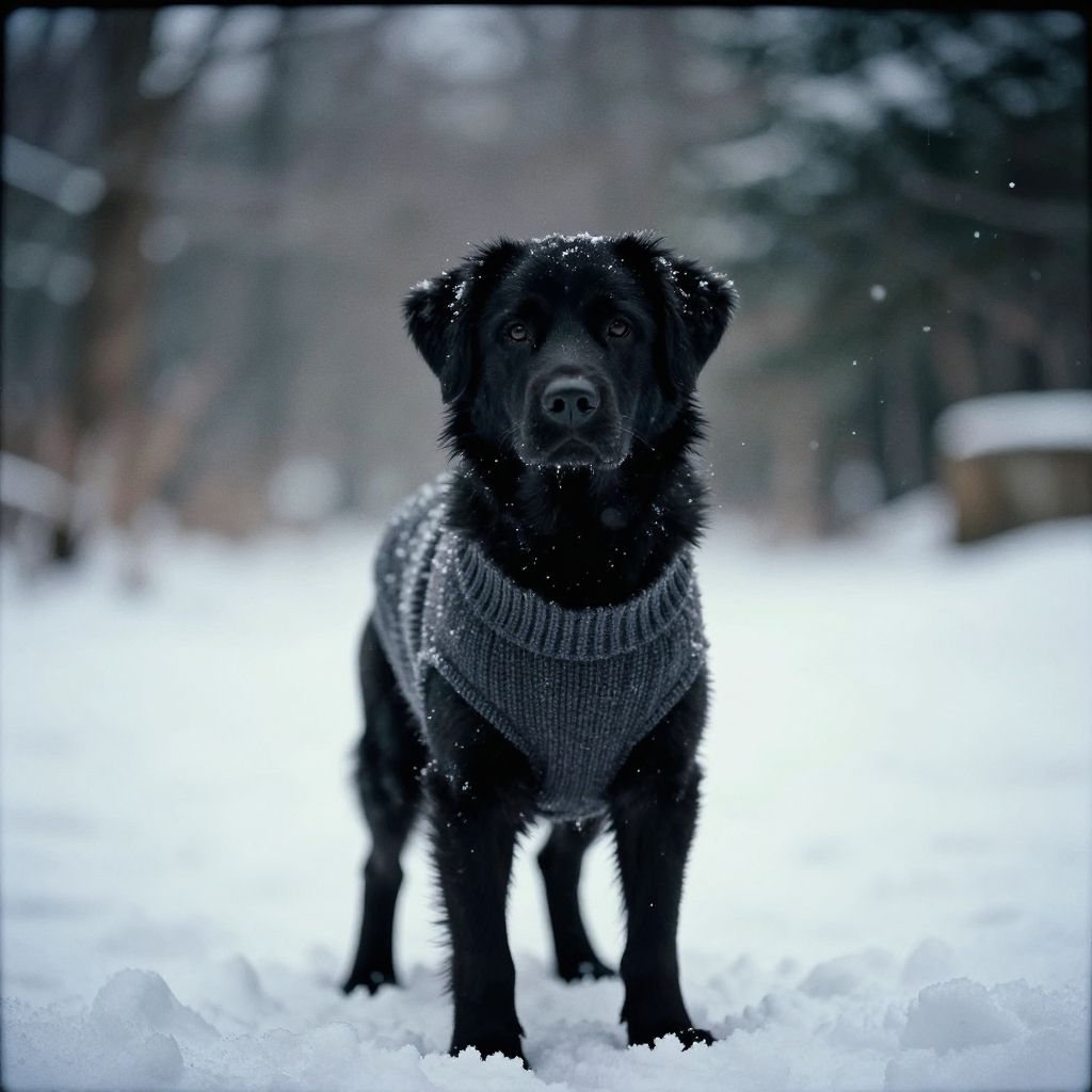 Photograph of a black dog standing in a snowy landscape. The dog is wearing a gray, knitted sweater with a textured pattern, and snowflakes are visible on its fur. The background is blurred, featuring dark, snow-covered trees, creating a stark contrast with the bright white snow. The dog is centered in the frame, looking directly at the camera with a slightly curious expression. The snow on the ground appears fluffy, and the overall atmosphere is cold and serene. The image has a slight blue tint, enhancing the wintry feel.