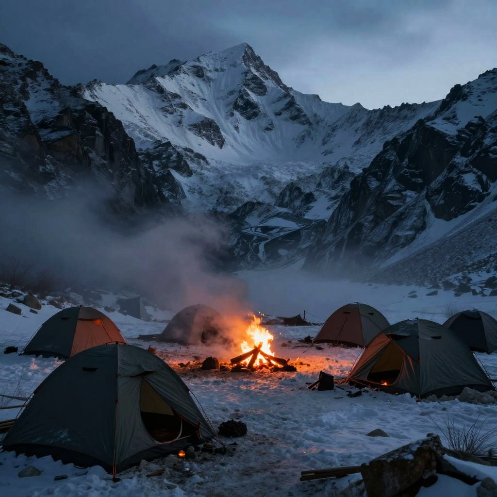 Dyatlov Pass mystery scene at twilight, snow-covered rugged mountains, eerie orange glows from campfires, hikers' tents torn and abandoned, fog rolling in, a chilling and suspenseful atmosphere, cinematic realism with cold blue and gray tones