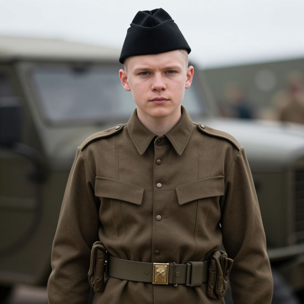 German costume accessories, 1boy, male focus, hat, belt, realistic, solo, world war ii, brown shirt, blurry background, blurry, shirt, looking at viewer, peaked cap, military, collared shirt, uniform, buckle, military hat, belt buckle, closed mouth, upper body, military uniform, black headwear, gloves, buttons, jacket, long sleeves, military vehicle, motor vehicle
