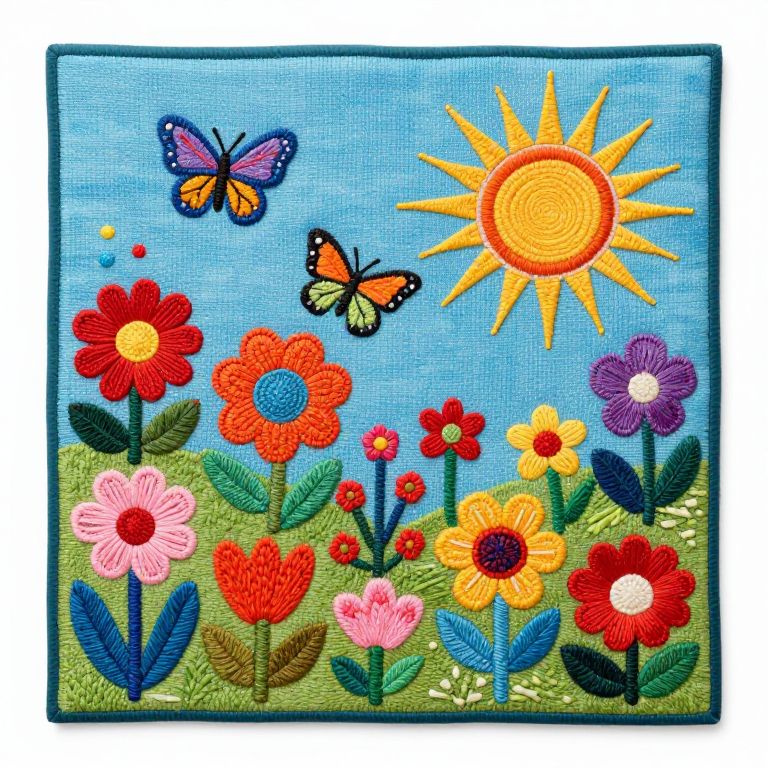 A vibrant Crazy Quilting and Embroidery artwork by Sharon Boggon, featuring a whimsical garden scene with colorful flowers, butterflies, and a radiant sun against a bright blue background, showcasing intricate handcrafted details and playful, folk-art-inspired aesthetics.