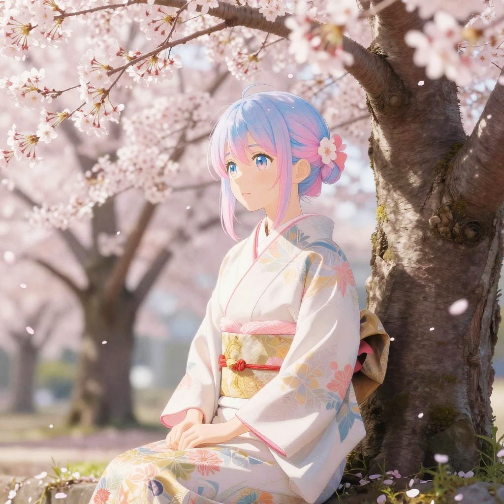 Blue and pink hair anime girl sitting under cherry blossom trees in full bloom, soft pastel colors, serene and peaceful atmosphere, traditional Japanese kimono with intricate patterns, gentle sunlight filtering through petals, delicate and dreamy style