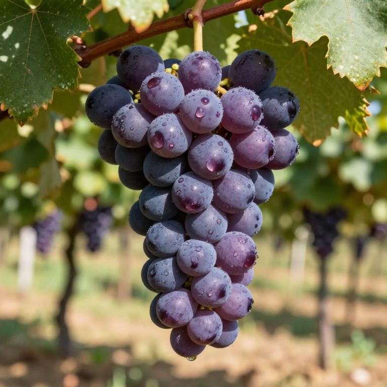 The biggest grape ever shown as a giant, hyper-detailed grape cluster hanging from a vine, with glistening water droplets and rich purple hues, set in a sun-drenched vineyard in late summer, very vibrant and naturalistic style.