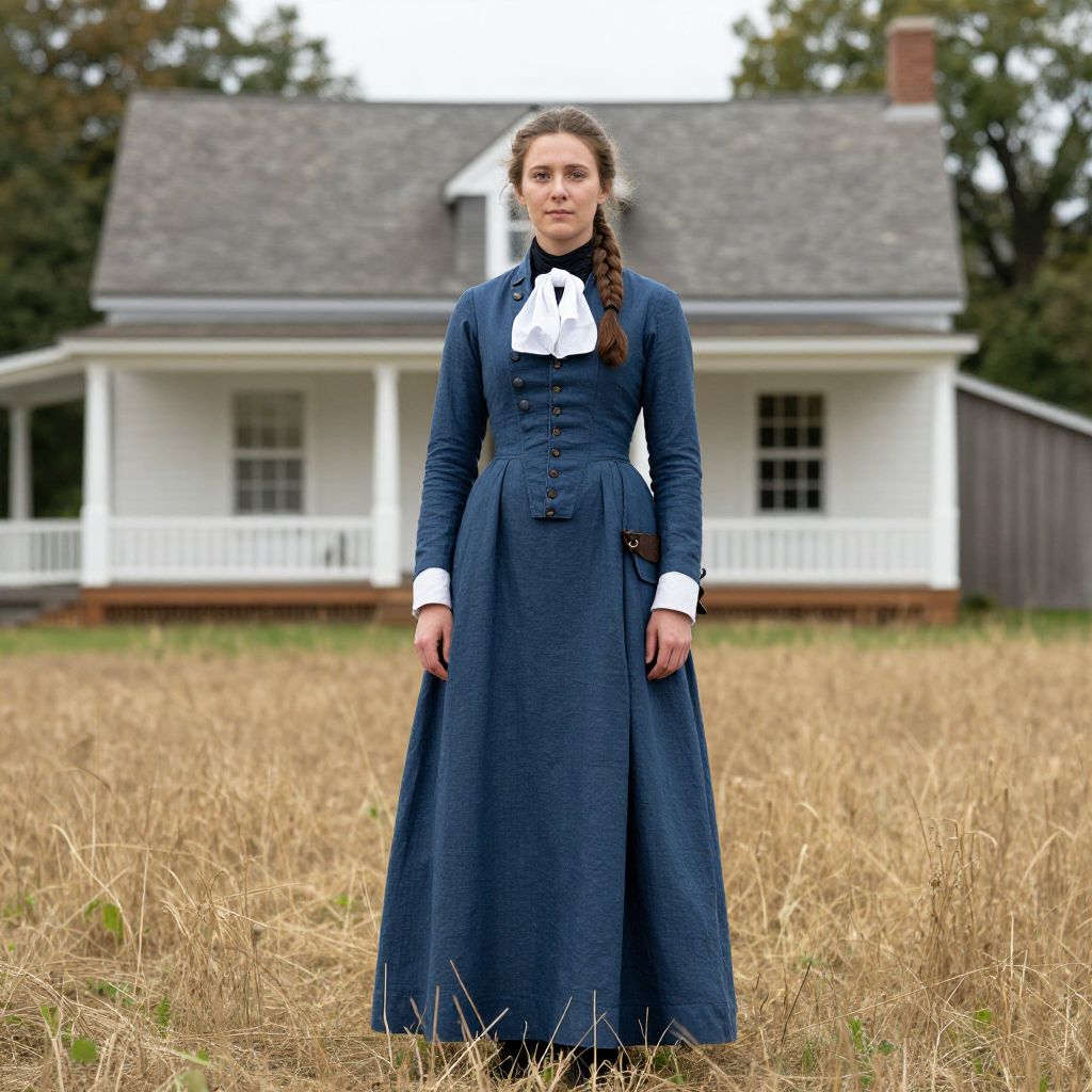 Photograph of a young woman standing in a golden-brown grass field in front of a white, two-story house with a gray shingled roof and white porch. She has fair skin, brown eyes, and long brown hair styled in a single braid. She is wearing a blue, long-sleeved, high-waisted dress with black buttons and a white lace-trimmed collar. Her hands are relaxed by her sides. The house has a small chimney and is partially obscured by trees in the background. The overall scene evokes a historical, rural setting.