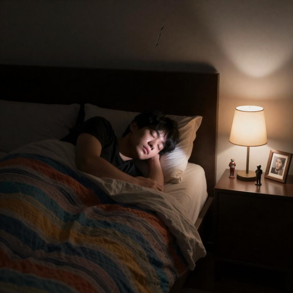 Photograph of a person sleeping in a dimly lit bedroom. Person lies in bed, under a colorful quilt, with light from a ceiling crack illuminating their face. Right side has a lamp, small statues, and a framed picture on a nightstand.