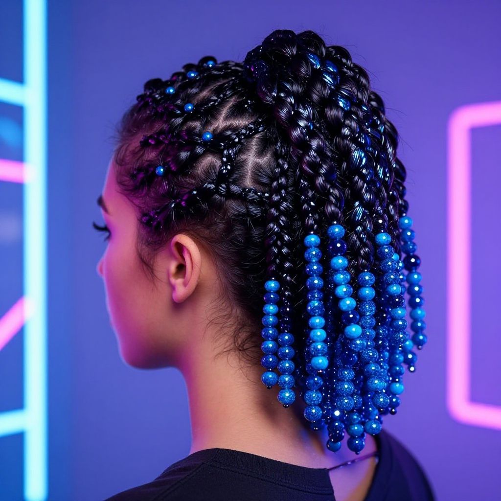 Box braids with blue beads styled into an elegant updo, glossy hair texture shimmering under studio light, beads catching reflections, set against a futuristic neon-lit background, cyberpunk aesthetic with vibrant color contrasts.