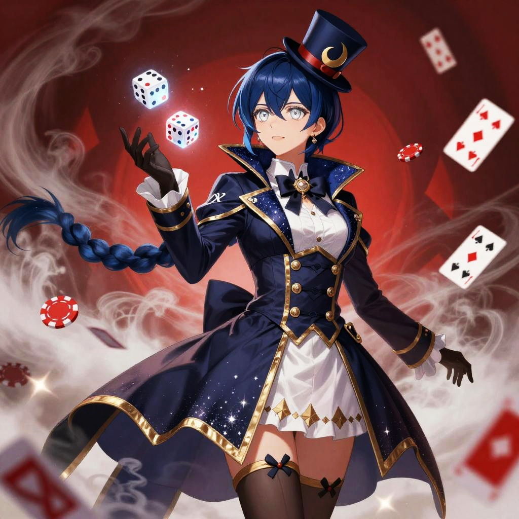 Anime style female character with midnight blue hair and silver eyes, wearing a circus illusionist frock coat with starry navy lining, asymmetrical tails, gold trim, and a small crescent-moon top hat, holding levitating jeweled dice and luminous poker chips, surrounded by floating playing cards. The scene features a dynamic swirling smoky background with bright red and white highlights, intricate costume details, sharp expressive eyes, and an energetic and magical atmosphere. Rendered in high contrast and vibrant colors as detailed digital art.