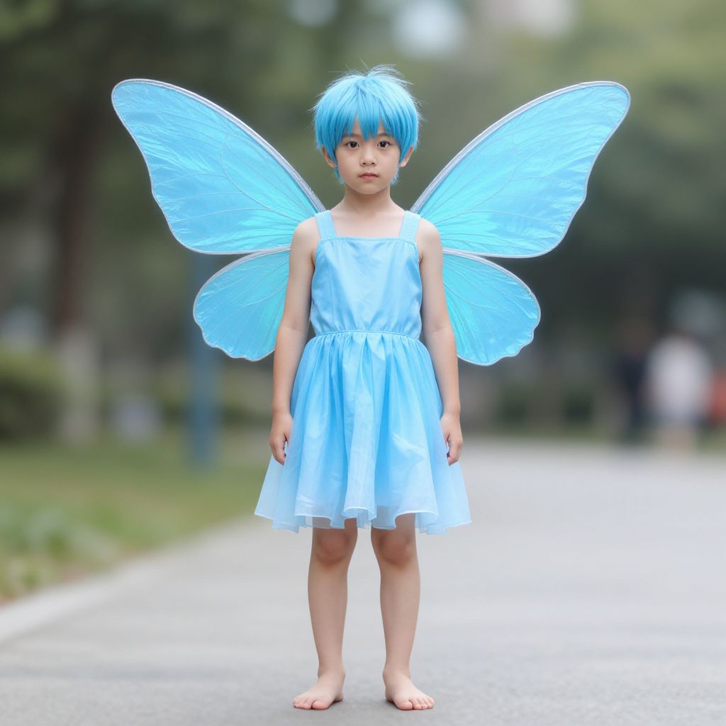 Blue fairy costume, wings, solo, 1boy, fairy, male focus, fairy wings, blue hair, dress, full body, insect wings, standing, looking at viewer, blue wings, barefoot, outdoors, blurry background