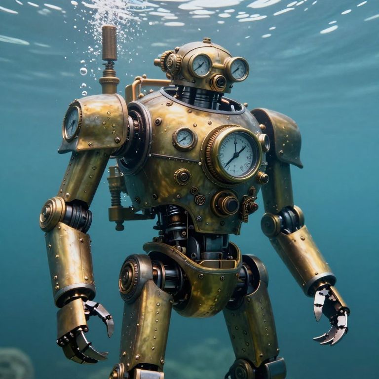 Photorealistic CGI of a brass, steampunk-style robot with multiple dials and gears, underwater with sunlight filtering through the blue water.
