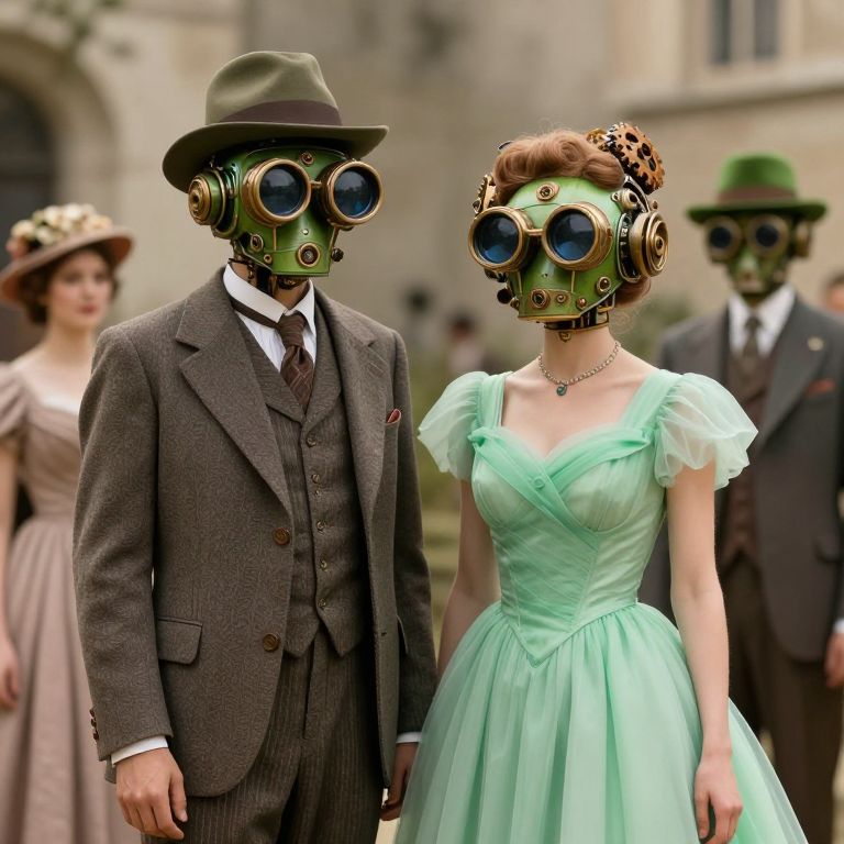 In this surreal, high-resolution image, two figures stand out with their fantastical attire and accessories. The male figure, dressed in a vintage suit and hat, wears a green, mechanical headpiece with two large, round lenses that resemble binoculars. The female figure, in a flowing, light green dress, has a similarly mechanical headpiece with two smaller lenses. Both headpieces are adorned with intricate details and gears, adding to the whimsical and retro aesthetic. In the background, other figures are present, dressed in period clothing, with one wearing a green hat and another in a suit. The overall composition is rich with texture and color, creating a dreamlike, vintage atmosphere.