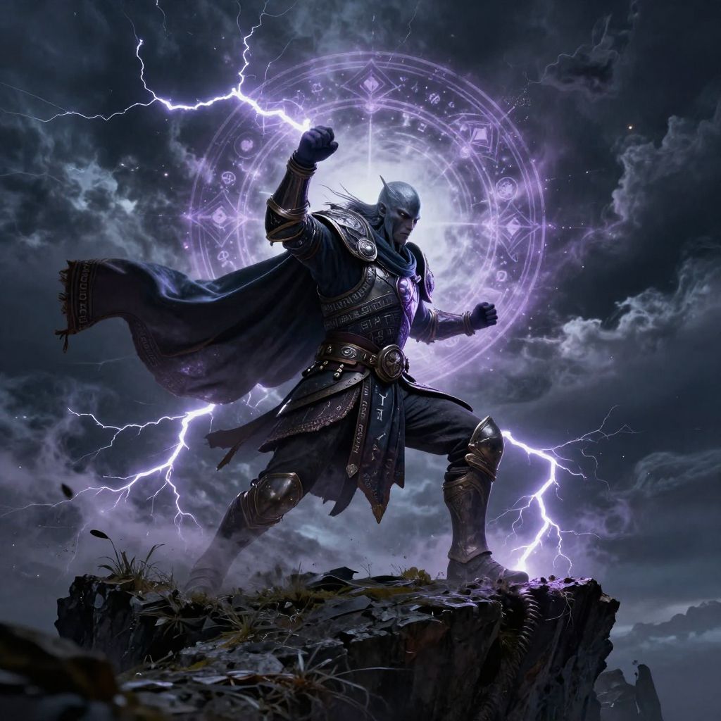 A digital artwork depicts a muscular, armored warrior with a blue helmet, standing on a rocky cliff amid a stormy, dark sky. He's surrounded by a glowing, purple magical circle with lightning bolts emanating from it. His left arm is raised in a powerful fist, and his right arm is bent at the elbow. He wears a flowing, dark cape and intricate armor with metal plates and belts. The background features dramatic, swirling clouds illuminated by vivid lightning. The scene exudes a sense of epic fantasy and magical power, with the warrior's intense posture and the dynamic, electrifying atmosphere.
