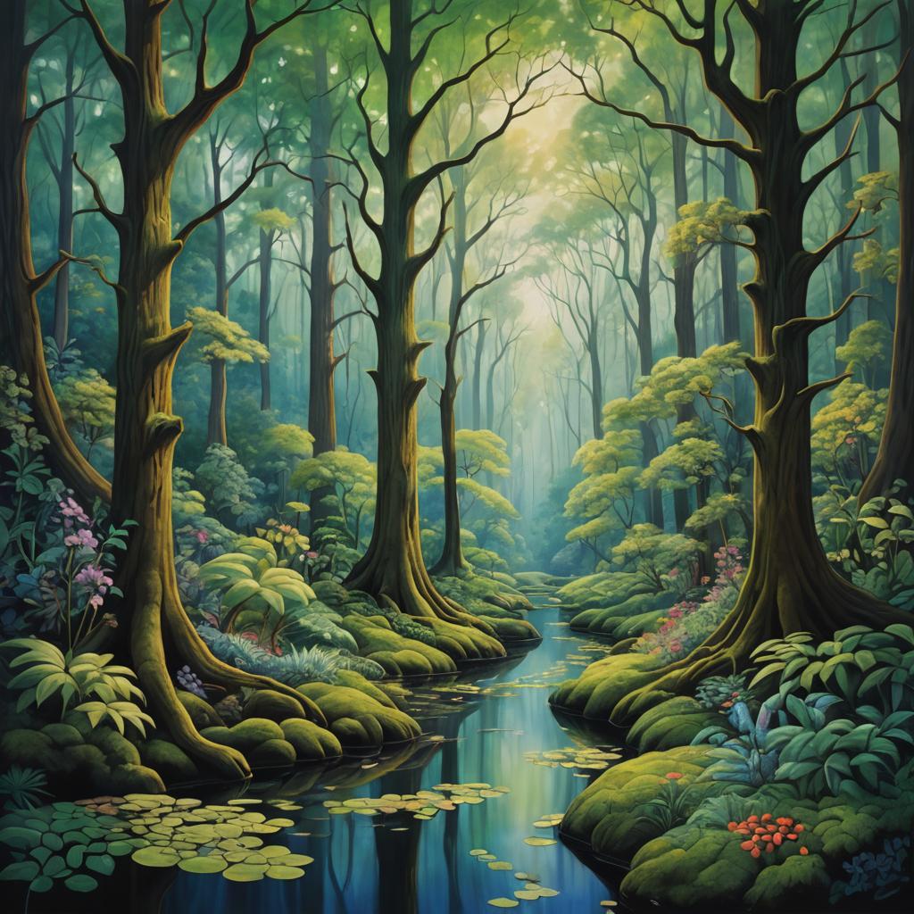 A highly detailed illustration of an enchanted forest, inspired by the artistic approaches of Claude Monet and Georgia O'Keeffe. This artwork incorporates oil painting techniques, blending influences from various renowned creators.