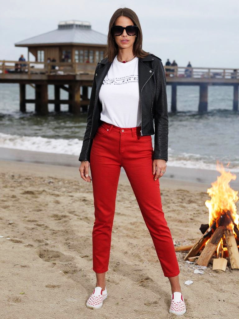 A tall woman in a Pedro Campos visual style, wearing a black biker jacket, white graphic tee, and bright red skinny jeans, stands at a beach bonfire near the pier, slip-on canvas sneakers and oversized sunglasses completing her look. Sexy. Pretty face and beаutiful eyes. Big breasts