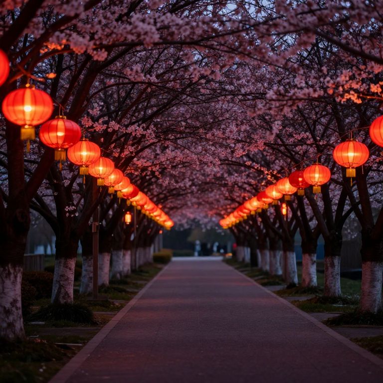 Photograph of a cherry blossom-lined path at dusk, illuminated by vibrant red lanterns hanging from trees, creating a romantic, symmetrical scene.