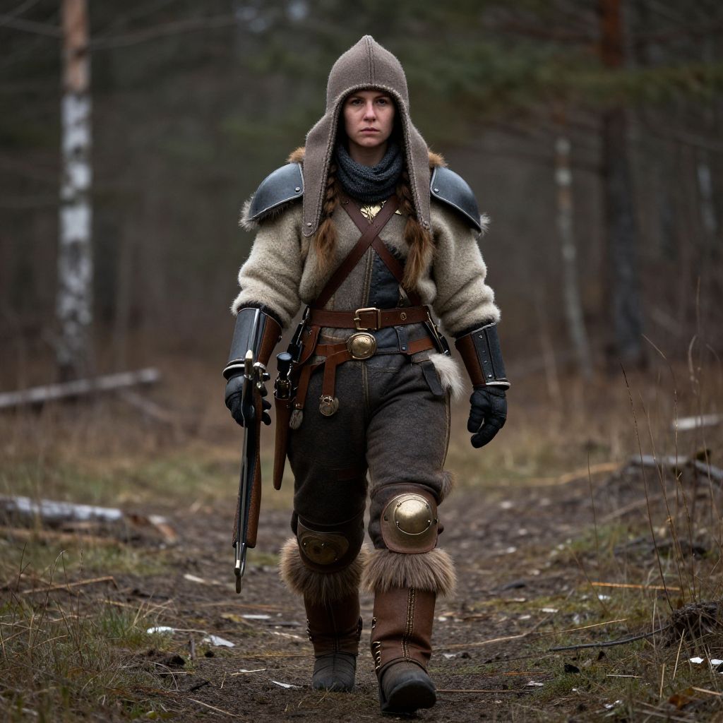 Marsh well-built inuit woman as steampunk hero wearing brown kagoul and holding a crossbow, she walks towards the camera with a mistrustful look,
