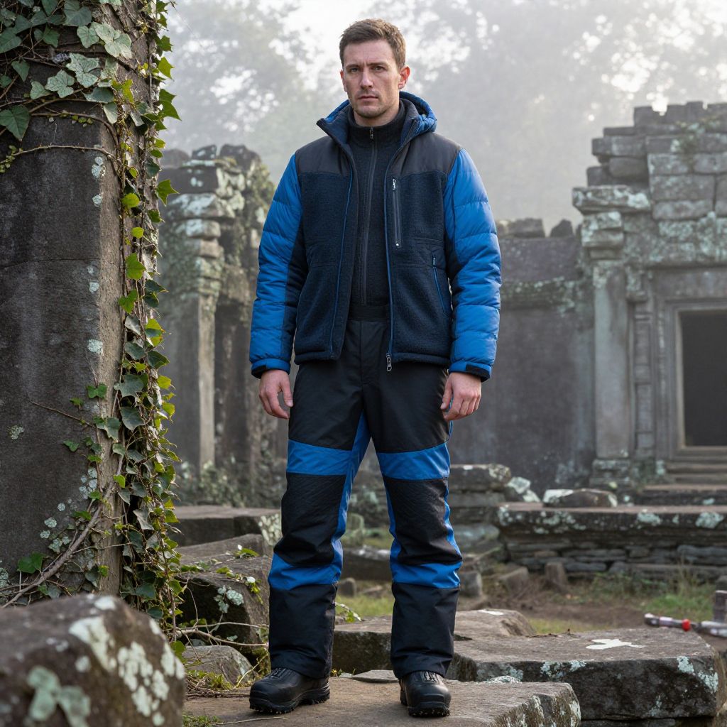 A man, insulated down jacket, high-performance synthetic base layer, soft fleece vest, waterproof ski bibs, traction-enhanced winter boots, black and electric blue, ancient stone ruins, overgrown with ivy, misty morning light, contemplative expression Man has masculine face and piercing eyes