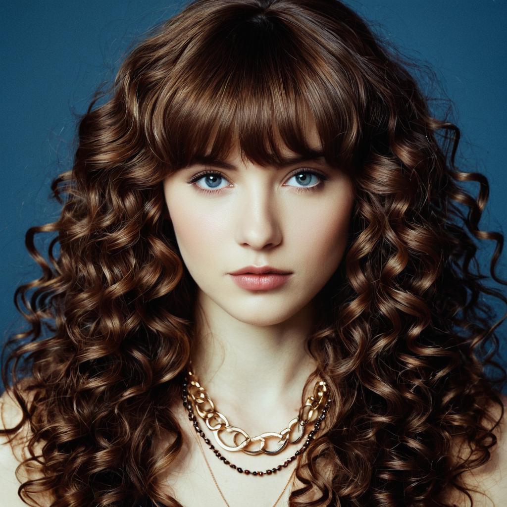 Brown curly bangs wig hair,1girl, solo, jewelry, curly hair, necklace, long hair, brown hair, looking at viewer, lips, upper body, realistic, wavy hair, blue eyes