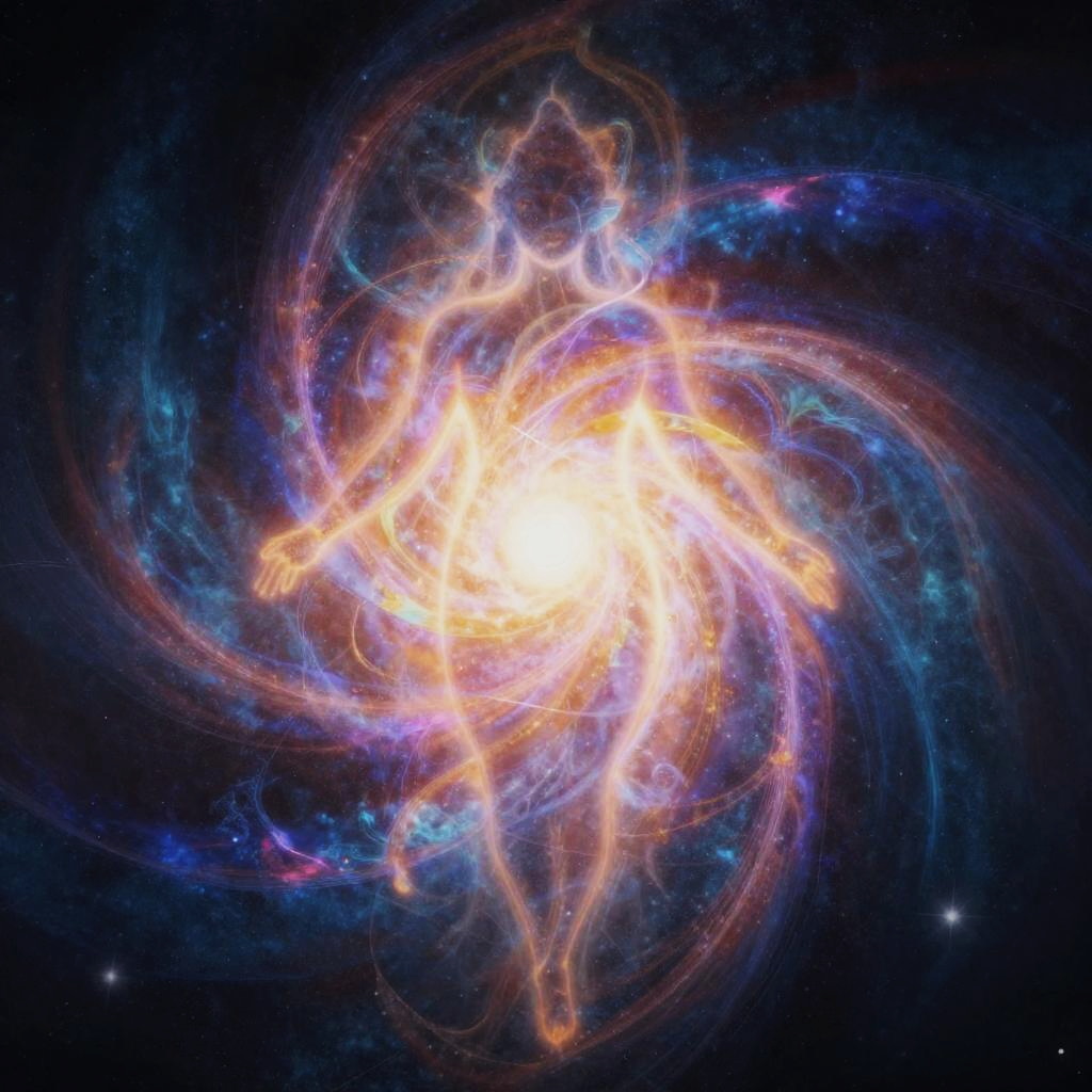 Dieu illustrated as an abstract divine entity composed of swirling light, color, and energy, forming a transcendent figure that fades seamlessly into the infinite cosmos, highlighting themes of omnipresence, mysticism, and universal connection.