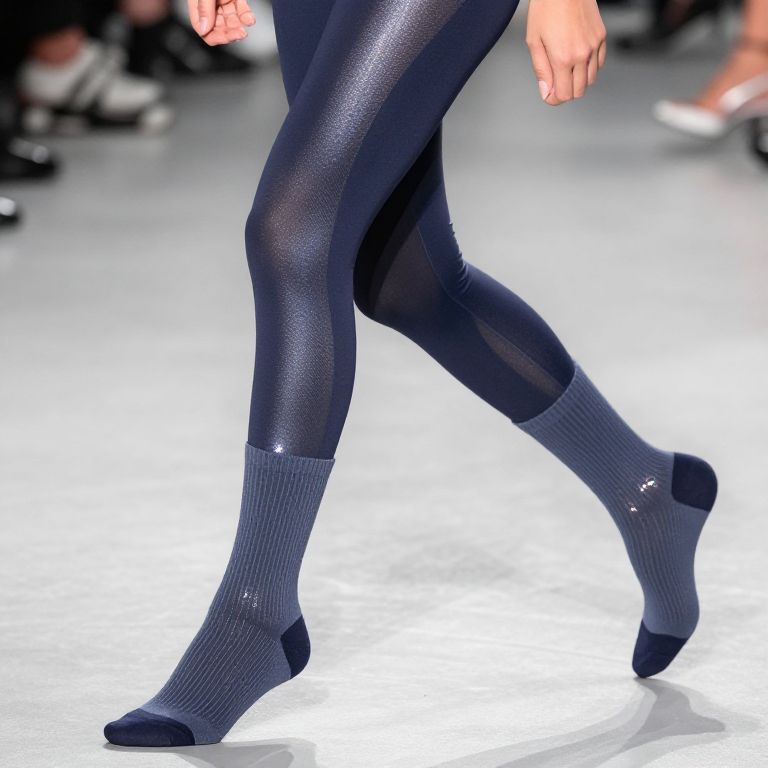 Photograph of a model's legs in shiny, dark blue, textured tights and ribbed, dark blue ankle socks, walking on a white runway