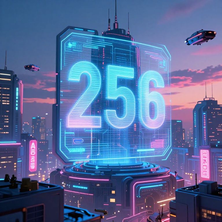 Futuristic cityscape with giant holographic display showing the number 256, neon signage and flying vehicles under a twilight sky, cyberpunk mood with blue and pink lighting, highly detailed and atmospheric