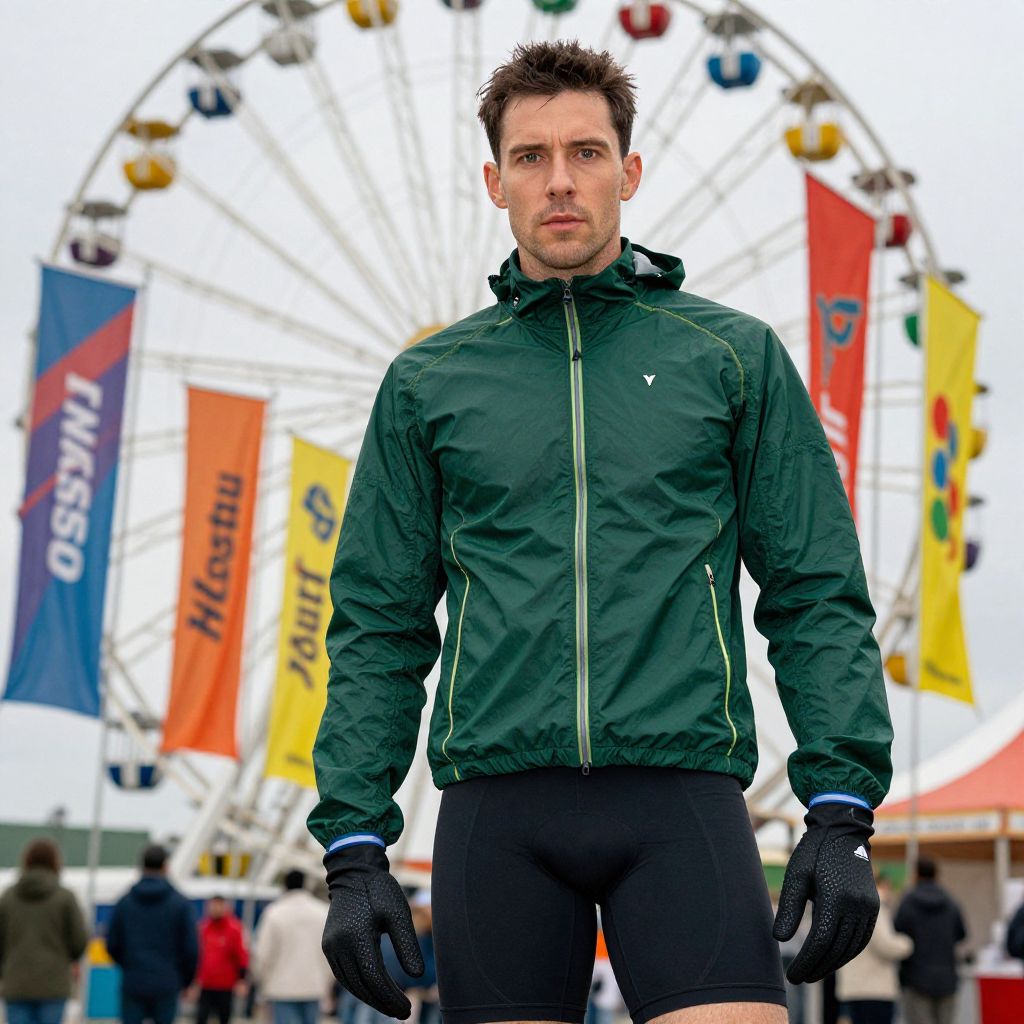 A man, fleece-lined cycling jacket, windproof outer layer, deep forest green, contrasting reflective piping, thermal bib shorts, breathable rain-resistant gloves, snug fit, vibrant banners fluttering, Ferris wheel towering, technicolor analog film stock, focused expression, ready for adventure. Man has masculine face and piercing eyes