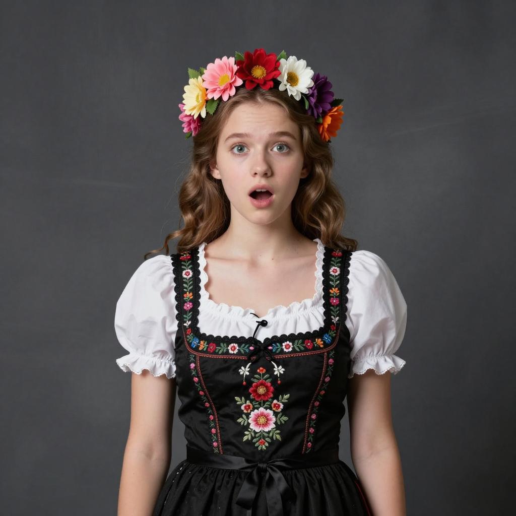 Portrait of a surprised teenage girl with wavy hair and a curvy figure, wearing a traditional black dirndl dress with white puff sleeves and floral embroidery, paired with a colorful floral crown. The image is set against a charcoal brushed texture studio background, highlighting the details of her outfit and natural makeup.