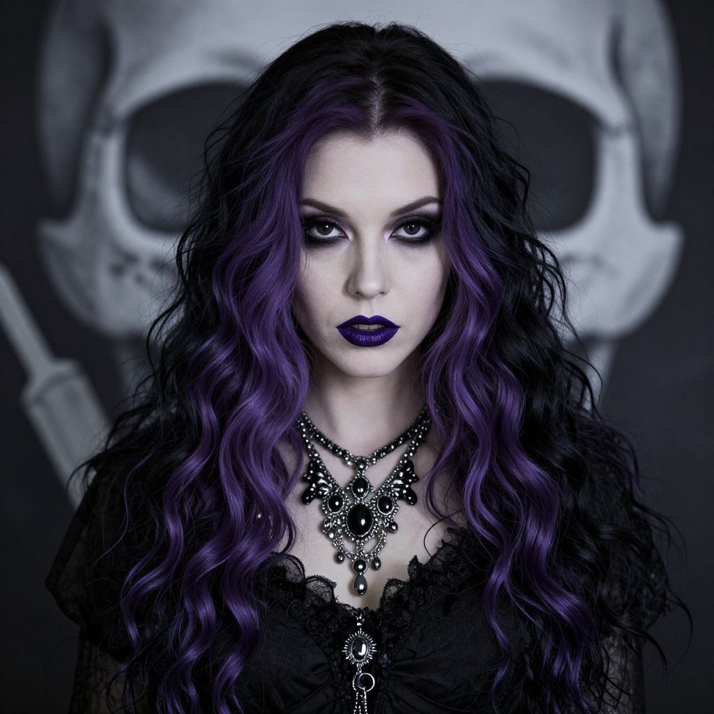 Photograph of a gothic-style woman with long, wavy purple and black hair, pale skin, and dark purple lipstick. She's wearing a black outfit and has a large, intricate black and silver necklace. Her expression is mysterious and slightly melancholic. The background features a black and white skull design, adding to the dark, eerie vibe. The overall aesthetic is gothic and edgy.