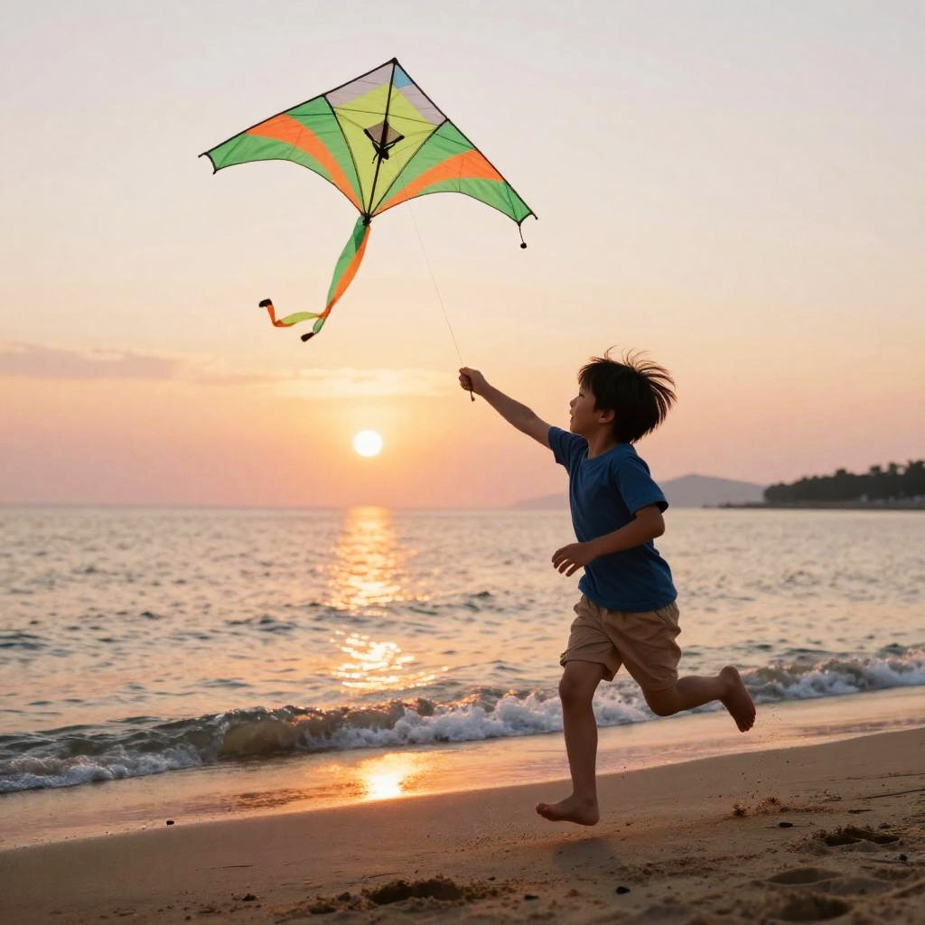 Kids photoshoot prompt showcasing a child at the beach during sunset, running along the shore with a kite, capturing movement and joy, with warm orange and pink hues reflecting on the water and sand, highlighting carefree childhood moments.