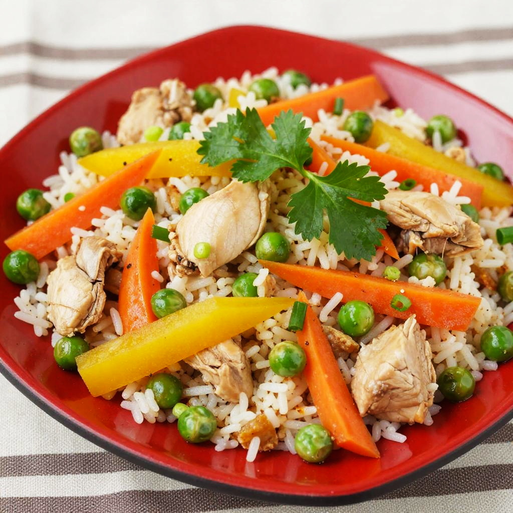 A close-up photo of a vibrant, colorful stir-fry dish on a square, red plate. The dish features fluffy rice, chunks of chicken, green peas, yellow carrots, and small pieces of green onions, all mixed together. A fresh green garnish sits in the center. The plate is set on a striped, brown and white fabric background, adding a cozy touch. The colors are bright and appetizing.