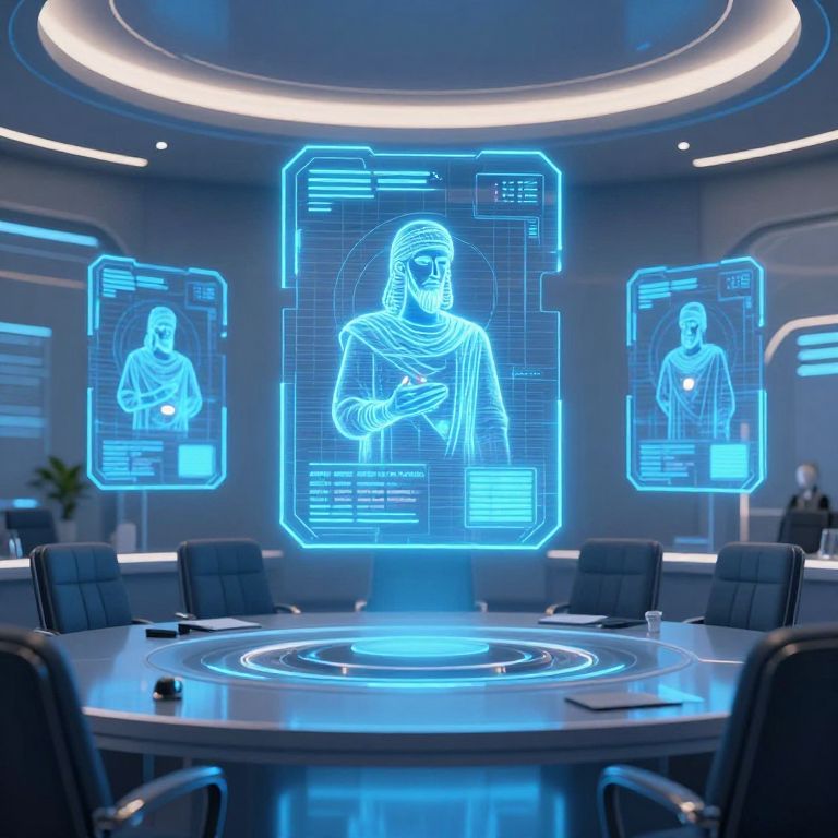 Commandments represented as futuristic holograms projected in a sleek, high-tech courtroom, neon blue lights, reflective surfaces, advanced technology aesthetic, blending the ancient concept with a sci-fi environment.