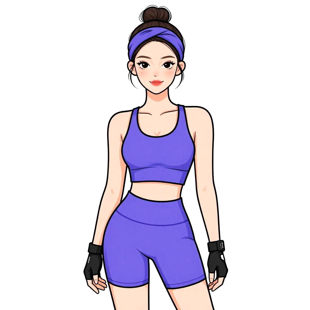 Woman with pretty face and pretty hair. Woman, athletic wear, coordinated two-piece workout ensemble in heathered blue, crop tank top with thin straps, matching high-waisted biker shorts, black fingerless gloves with text detail, natural hair styled in a headwrap, minimalist white studio background --sref 1467