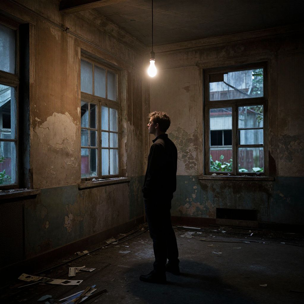 Man standing in dark room illuminated by a single flickering light bulb, old abandoned warehouse with peeling paint and broken windows, deep shadows engulfing corners, gritty urban decay aesthetic, dramatic contrast and texture.