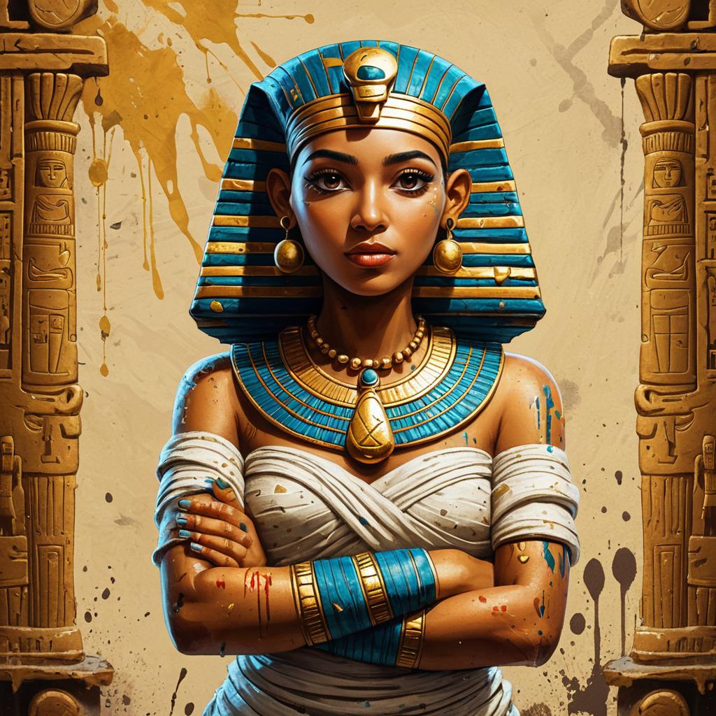 A cartoon-style character design of a whimsical dragon, with her arms crossed, wearing a colorful scale-patterned vest, large expressive eyes, a spiked collar in shades of blue and green, background features splashes of paint and textures to give it an artistic feel