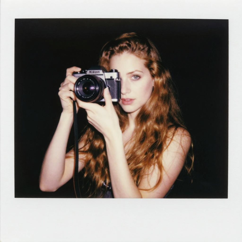 A high-contrast photograph of a fair-skinned, red-haired woman holding a black Canon DSLR camera against a solid black background. She has long, wavy hair cascading over her shoulders and is looking directly at the camera with a slight, confident smile. Her right hand holds the camera up to her face while her left hand supports it from below. She is wearing a black sleeveless top, and the camera's lens is centered in the frame. The image has a white border, giving it a polaroid-like appearance. The lighting highlights her facial features and hair, creating a dramatic effect.