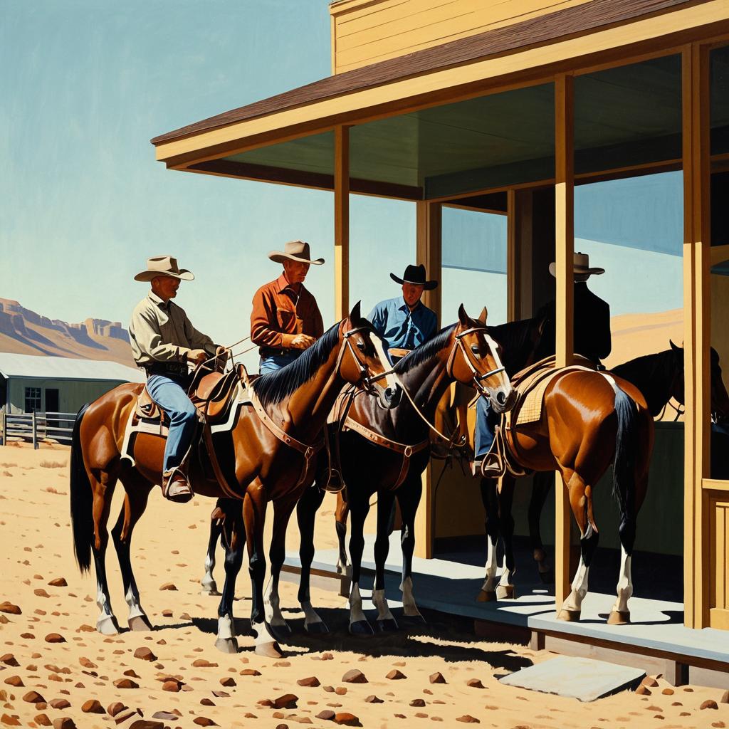 A captivating painting combining the precisionist style reminiscent of Edward Hopper and Charles Sheeler with retro futurism. The artwork depicts 1960s American cowboys wearing classic cowboy hats and denim, taming horses outside a building with a warm and inviting color palette. The desert landscape features rocky terrain and distant mesas under a clear blue sky, emphasizing the precise shadows and architectural elements.