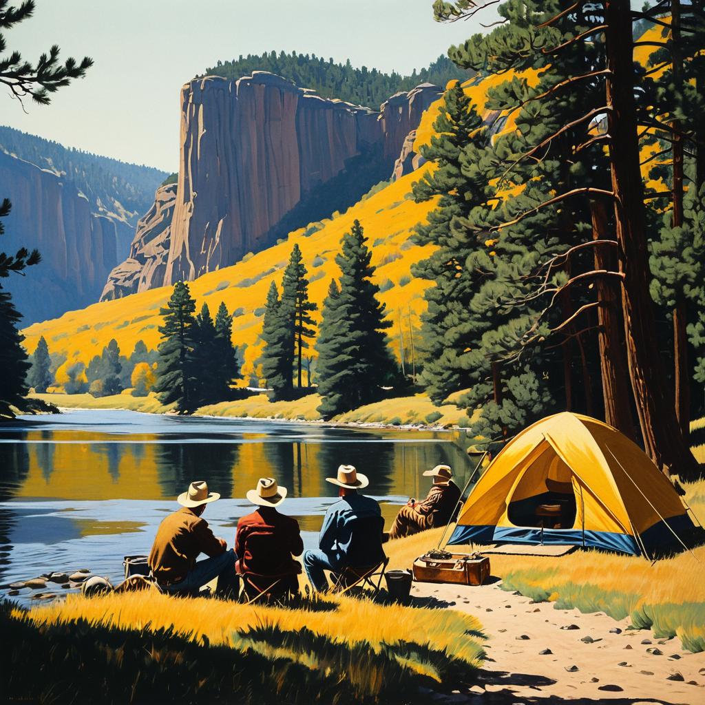 Adoration create a captivating painting that combines the precisionist style of Edward Hopper and Charles Sheeler with retro futurism. The artwork features 1960s American cowboys participating in horse taming with a warm inviting color palette.