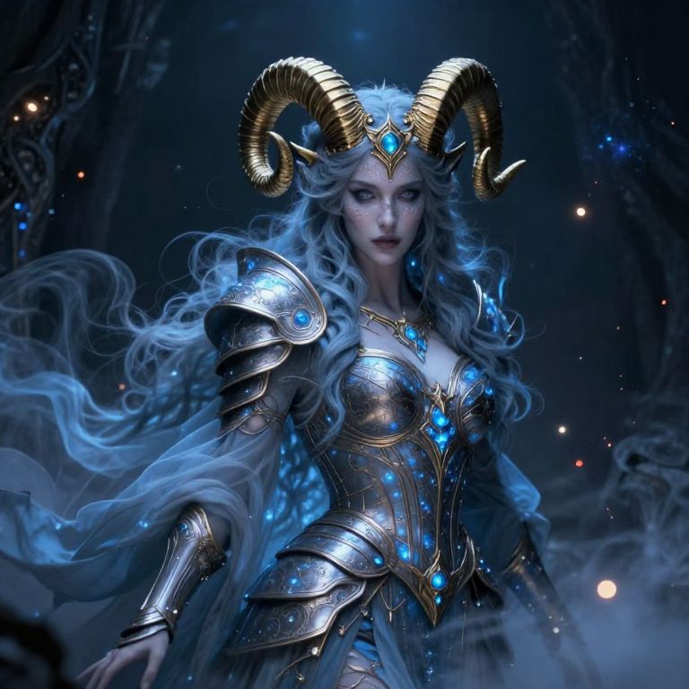 Female minotaur dnd mage casting powerful arcane spells in a ruined temple, swirling magical energy surrounding her, delicate yet fierce expression, wearing flowing robes decorated with gold and runes, glowing eyes and horns, mystic atmosphere with ethereal light