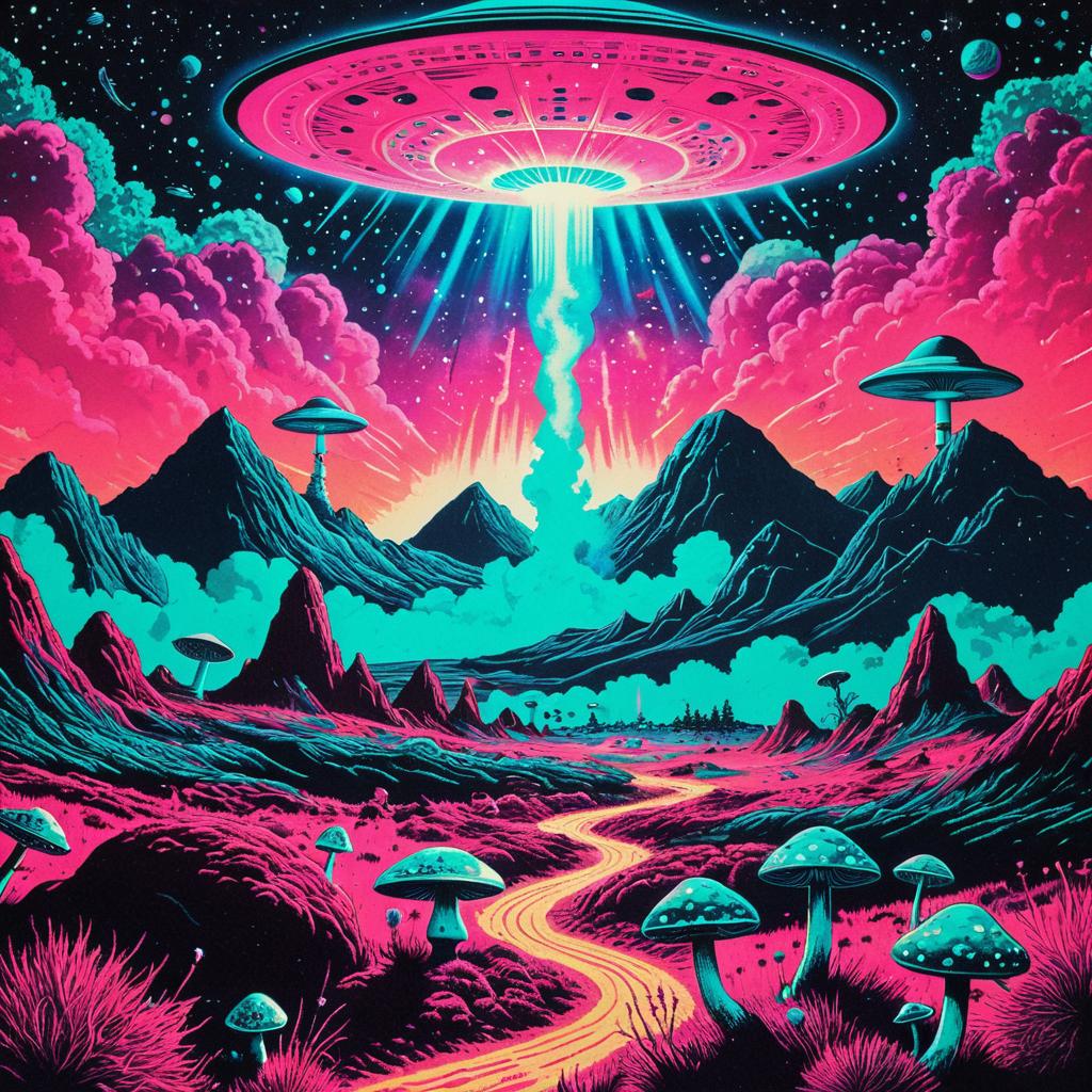 Vintage 70s black light poster of nebula foxes, smoking joints, alien landscape, UFO flying saucers, psilocybin cubensis mushrooms, vibrant trippy colors, pink and teal gradients, cosmic dust and swirling clouds