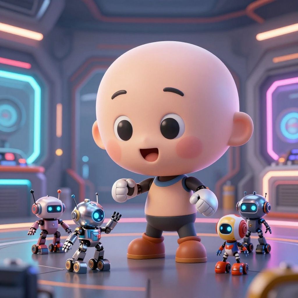 Cartoon character with big head and small body playing with robotic toys in a futuristic room, neon lights, sleek metallic textures, playful expression, detailed background, sci-fi vibe.