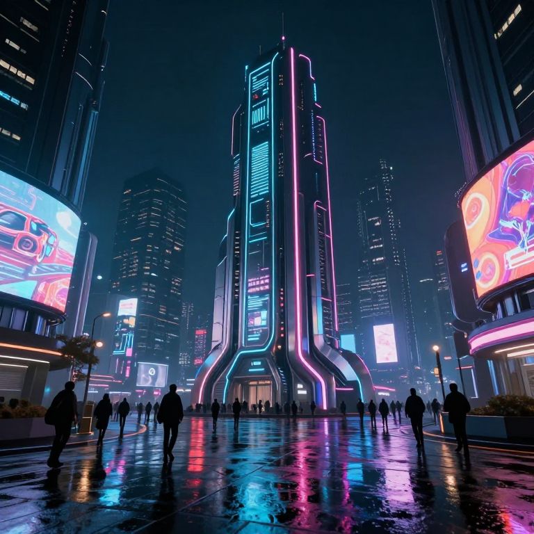 Photograph of a futuristic, neon-lit cityscape at night. A towering skyscraper, adorned with vibrant pink, blue, and purple neon lights, stands centrally, reflecting on the wet, glossy street below. Surrounding buildings feature large, brightly colored LED billboards with abstract designs. Silhouetted figures of people walk on the street, creating a sense of scale. The sky is dark, enhancing the vivid neon colors. The scene has a cyberpunk aesthetic, with sharp, sleek lines and a high-tech atmosphere. Reflections on the wet pavement add depth and a sense of realism to the image.