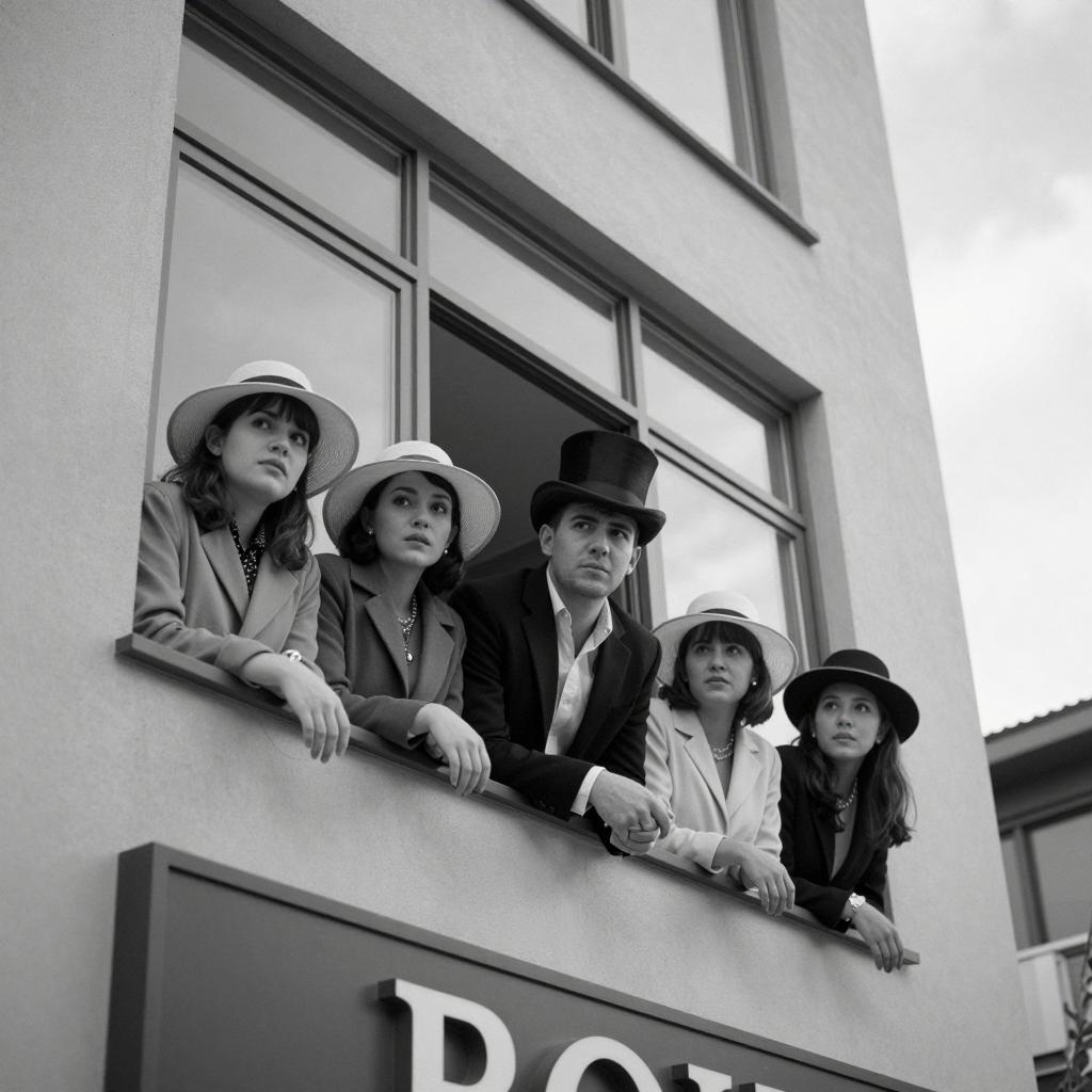 Five people on a staircase. Man in black hat and red bowtie in foreground, smiling. Boy in brown coat and hat in middle. Young boy behind him. Woman in red coat and black hat holding cane on right. Man in dark suit on far right. Staircase with white walls and wooden steps.