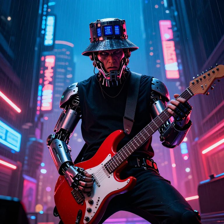 Buckethead character as a cyborg guitarist in a dystopian cityscape, towering skyscrapers, neon signs, digital rain, intense expression, detailed mechanical bucket helmet with digital displays, dramatic lighting, vibrant color palette blending blues and reds