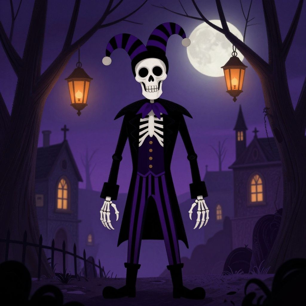 Digital illustration of a skeletal, Jack-o'-lantern-headed figure in a black, striped jester outfit, standing in a spooky, purple-lit