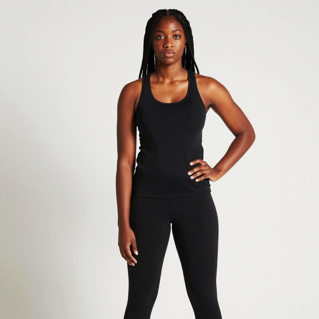 Photograph of a confident Black woman with dark skin, standing against a plain white background. She has long, thin, braided hair and is wearing a form-fitting, black sleeveless tank top and black leggings. Her right hand rests on her hip, while her left arm hangs by her side. She has a serious expression, with dark, defined eyebrows and full lips. Her physique is athletic with a toned build. The image is brightly lit, emphasizing her dark clothing and skin tone against the stark white background.