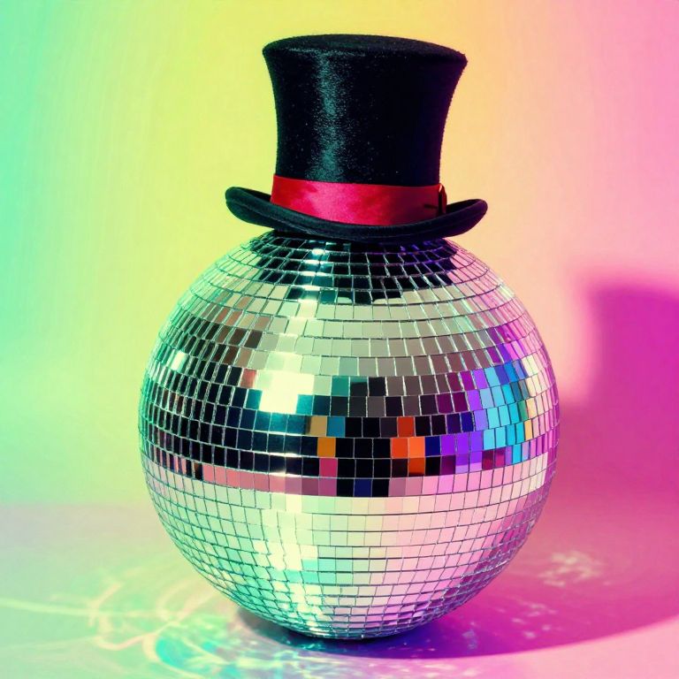 Top Hat /Lo-Fi aesthetics of a dance with a disco ball, bright contrasting color palette of Vaporwave, then utilize various Vintage-inspired tones and filters,