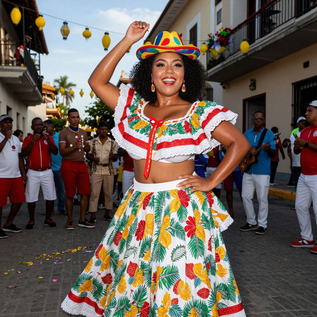 Energetic Puerto Rican festival dancer showcasing traditional movement during a street celebration, dressed in a vibrant outfit with bold red, white, and green patterns, posing mid-dance in a lively plaza with confetti, lanterns, and local music echoing, featuring a strong-featured woman with curly black hair, sun-kissed skin, and a bold, confident smile, wearing a colorful hat and traditional attire.. The woman has big tits and cute face
