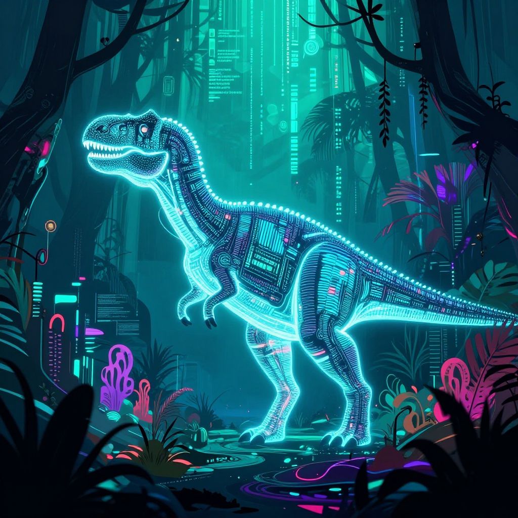 Dinosaur AI exploring a digital jungle made of data streams and code, glowing dinosaur silhouette surrounded by abstract cyber elements, surreal and vibrant environment, combination of biological and technological visuals, modern art style.