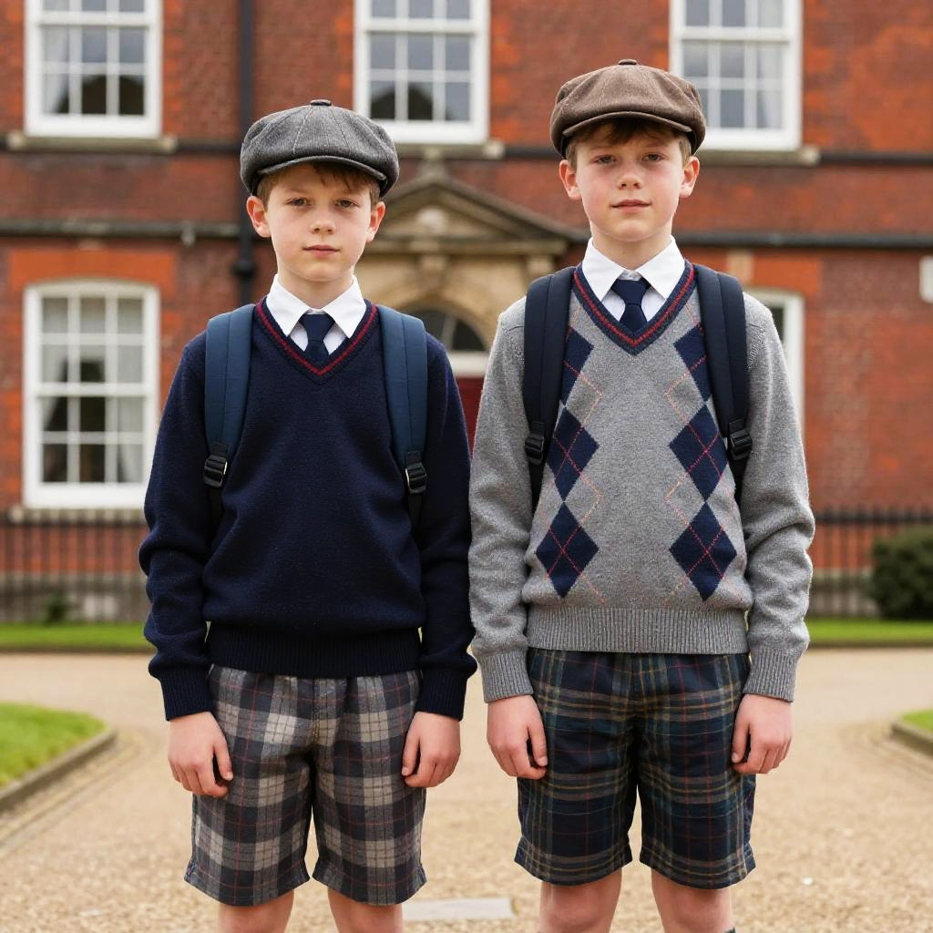 British schoolboy uniforms, vintage style with flat caps, argyle sweaters, and plaid shorts, posed in front of a traditional red brick school building, soft natural light, detailed textures