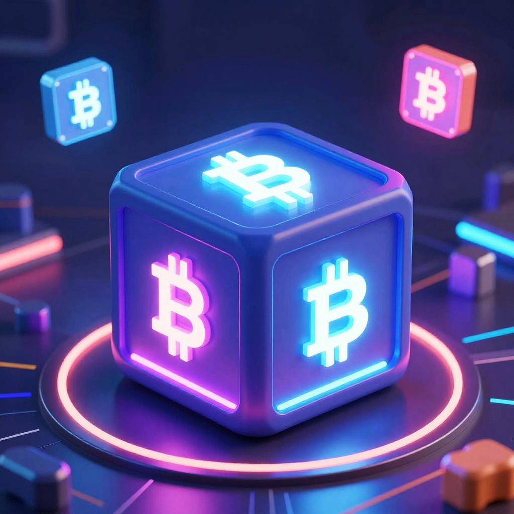 Crypto mystery box glowing with neon lights on a futuristic digital background, surrounded by floating blockchain symbols, cyberpunk style, hyper-detailed, vibrant colors
