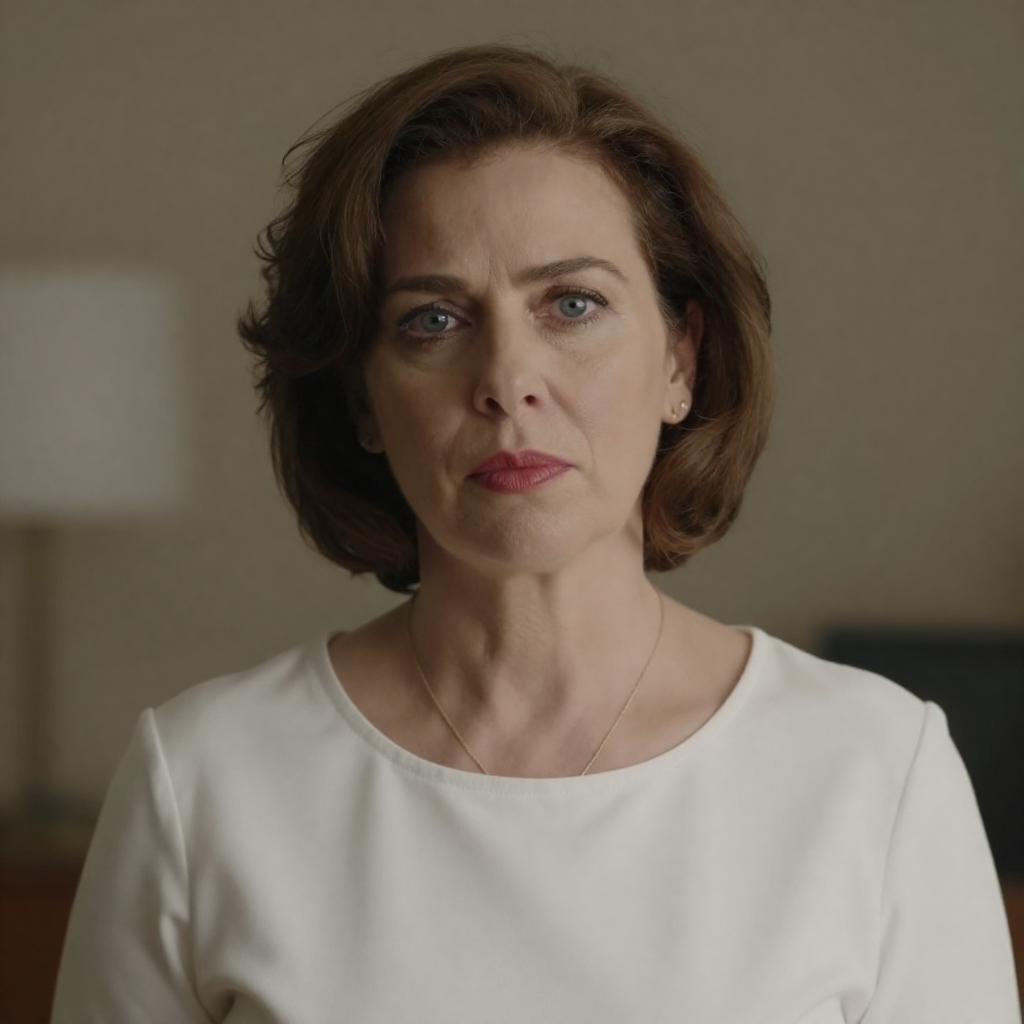 Photograph of a middle-aged woman with short, curly brown hair, wearing a red, long-sleeved dress with a V-neck. She stands in a dimly lit room with a warm, red-toned lamp in the background. Her expression is serious and focused. The background is blurred, emphasizing her presence.